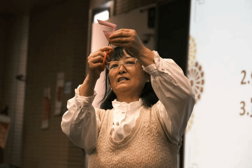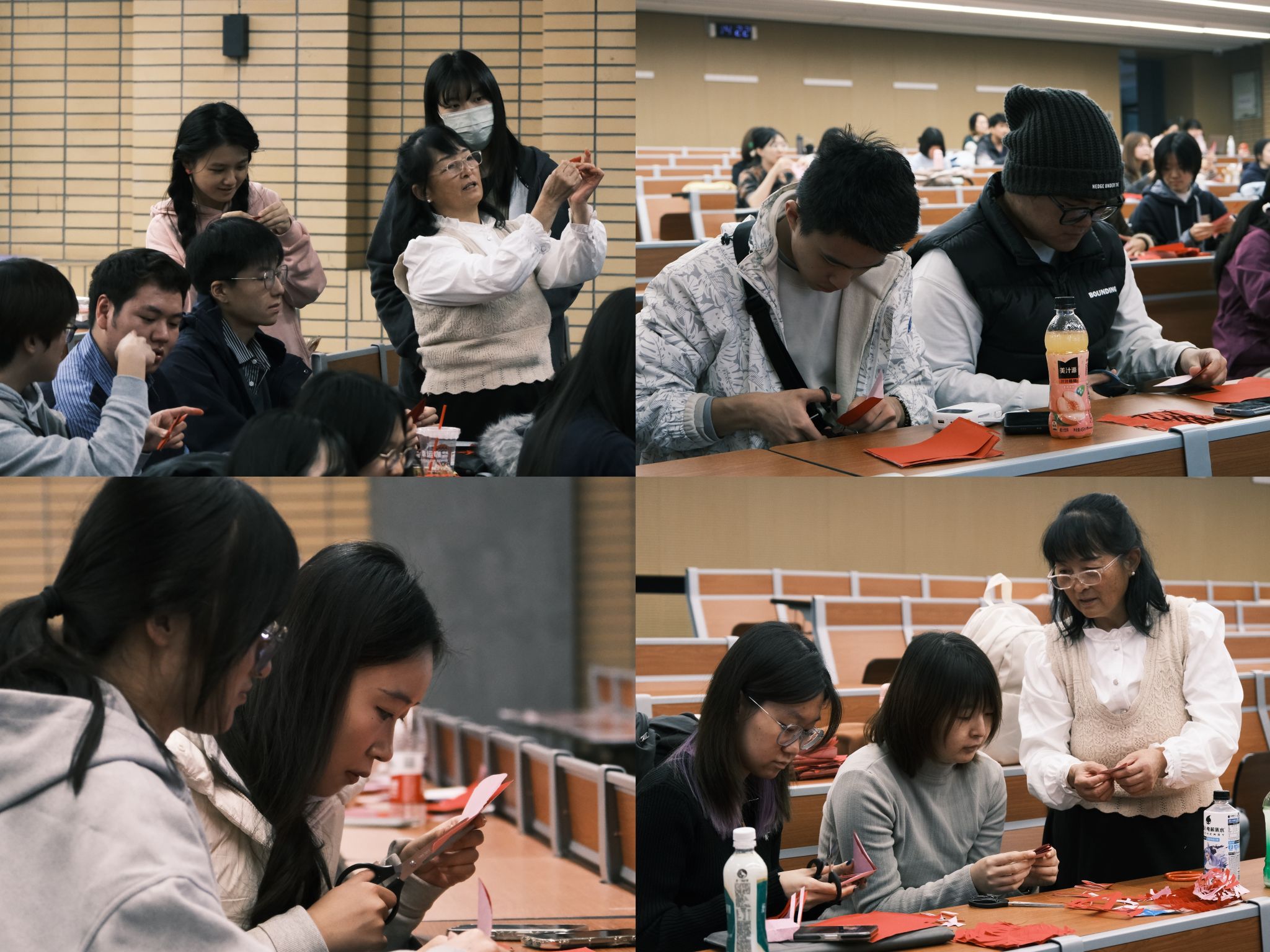 在互动体验环节,在李爱荣女士的耐心指导下,英语学院学生们上手操作,亲身从最简单的“网兜”造型做起,再到“喜”字、立体“春”字、枫叶、窗花等剪纸图案。在近三个小时的体验中,全场同学聚精会神,耐心听取李老师讲解步骤,时不时传来欢声笑语,同学们的桌上渐渐堆满了色彩鲜艳的剪纸作品,每一件都承载着对传统艺术的理解与创新。