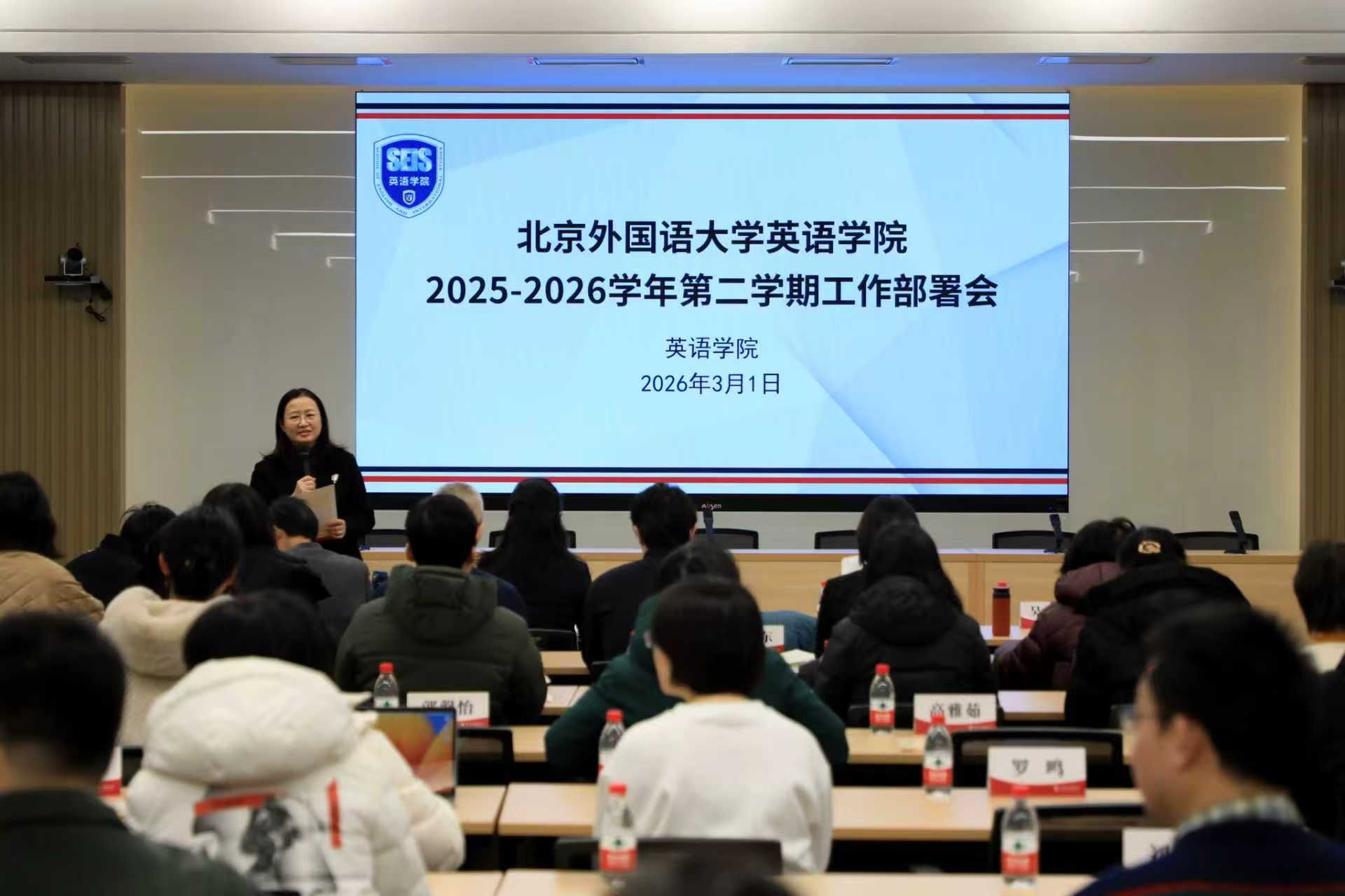 3月1日,英语学院2025-2026学年第二学期工作部署会在晨读厅召开,传达学校春季学期工作部署会精神,聚焦学院新学期重点任务,推进人工智能赋能教育教学改革,全面落实立德树人根本任务。全体教职工参加会议,院长杨鲁新主持会议。