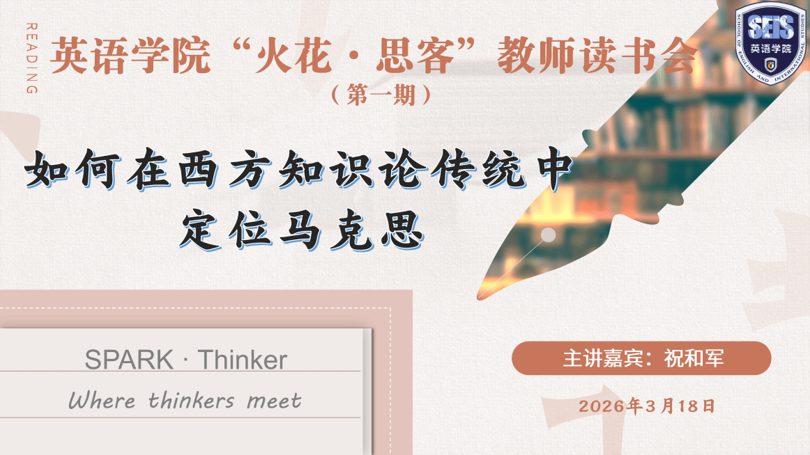 2026年3月18日下午,英语学院党总支、工会联合举办“火花·思客”(SPARK·Thinker)教师读书会(第一期),本次活动特邀北京外国语大学马克思主义学院党总支书记、副教授祝和军,围绕其著作《像马克思一样思考》作专题分享。学院30余名教职工参加活动,活动由组织员王欣扬主持。