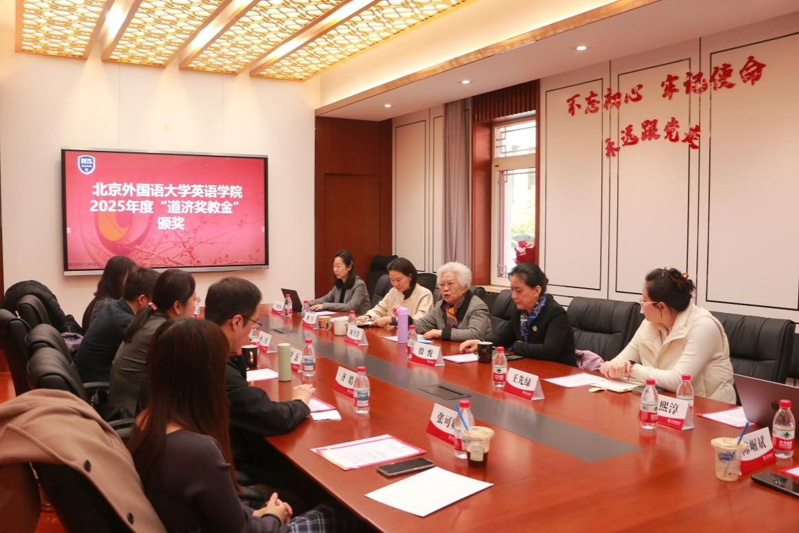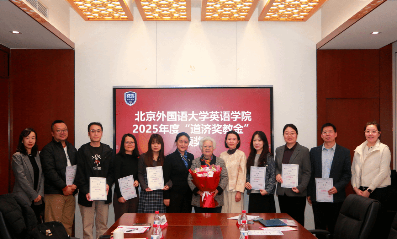 2026年3月31日,北京外国语大学英语学院联合校友办、教育基金会举办2025年度“道济奖教金”颁奖仪式。北外原党委书记、校长陈乃芳,校友办主任、教育基金会秘书长姚雪,英语学院党总支书记殷悦出席仪式,仪式由英语学院组织员王欣扬主持,10位获奖教师及相关人员参加活动。