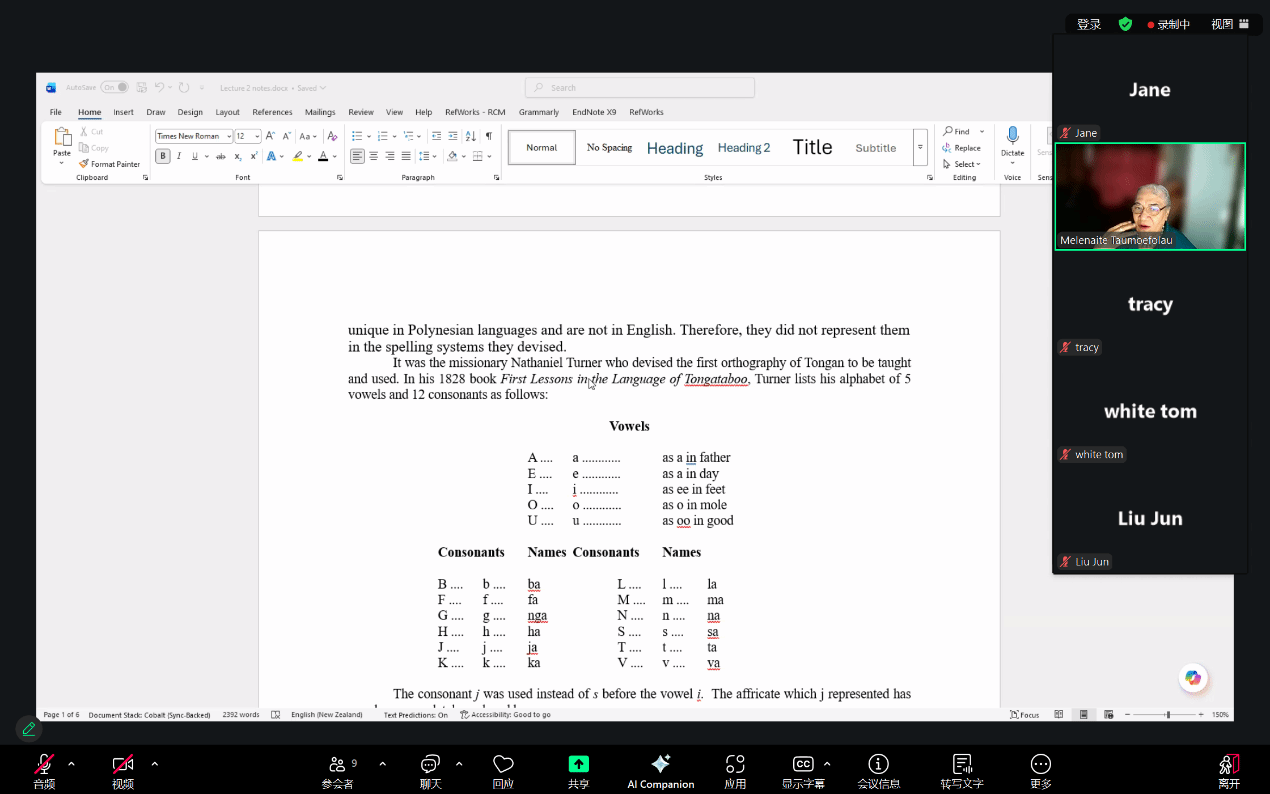 2025年12月17日下午,应北京外国语大学英语学院南太平洋语言与文化中心和世界语言博物馆邀请,汤加语外国专家梅莱奈伊特·塔乌莫艾富拉乌(Melenaite Taumoefolau)博士在线上做了题为“波利尼西亚语言语音学与正字法相关问题”(Issues in Polynesian Phonology and Orthography)的讲座。讲座由英语学院教师李菅主持,来自校内外多名师生参加了本场讲座。