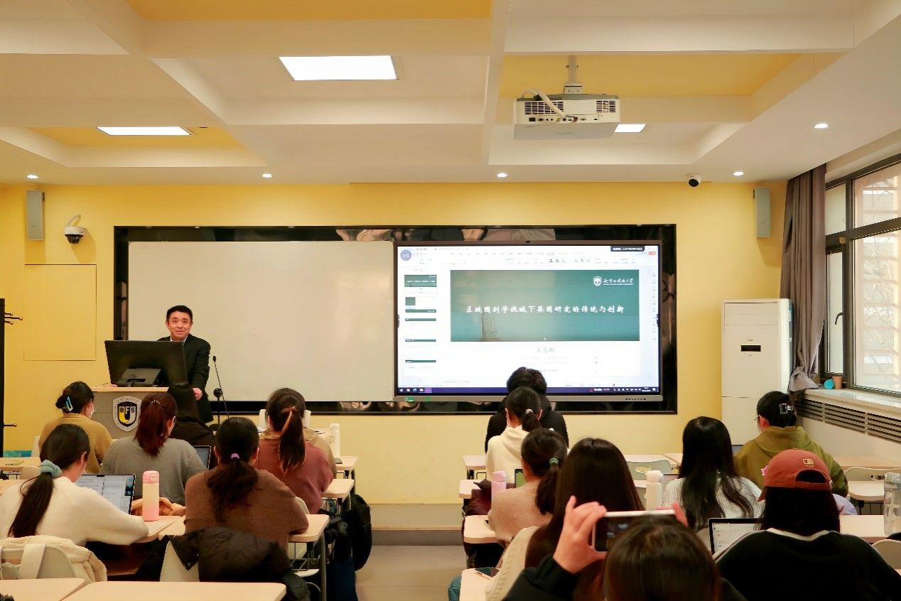 2025年12月17日,北京外国语大学英语学院“知周讲堂”系列讲座在英语学院417教室成功举办。区域与全球治理高等研究院常务副院长、英语学院英国研究中心主任,王展鹏教授应邀做了题为“区域国别学视域下英国研究的传统与创新”的专题学术讲座。本次讲座吸引了院内外众多师生到场参与。