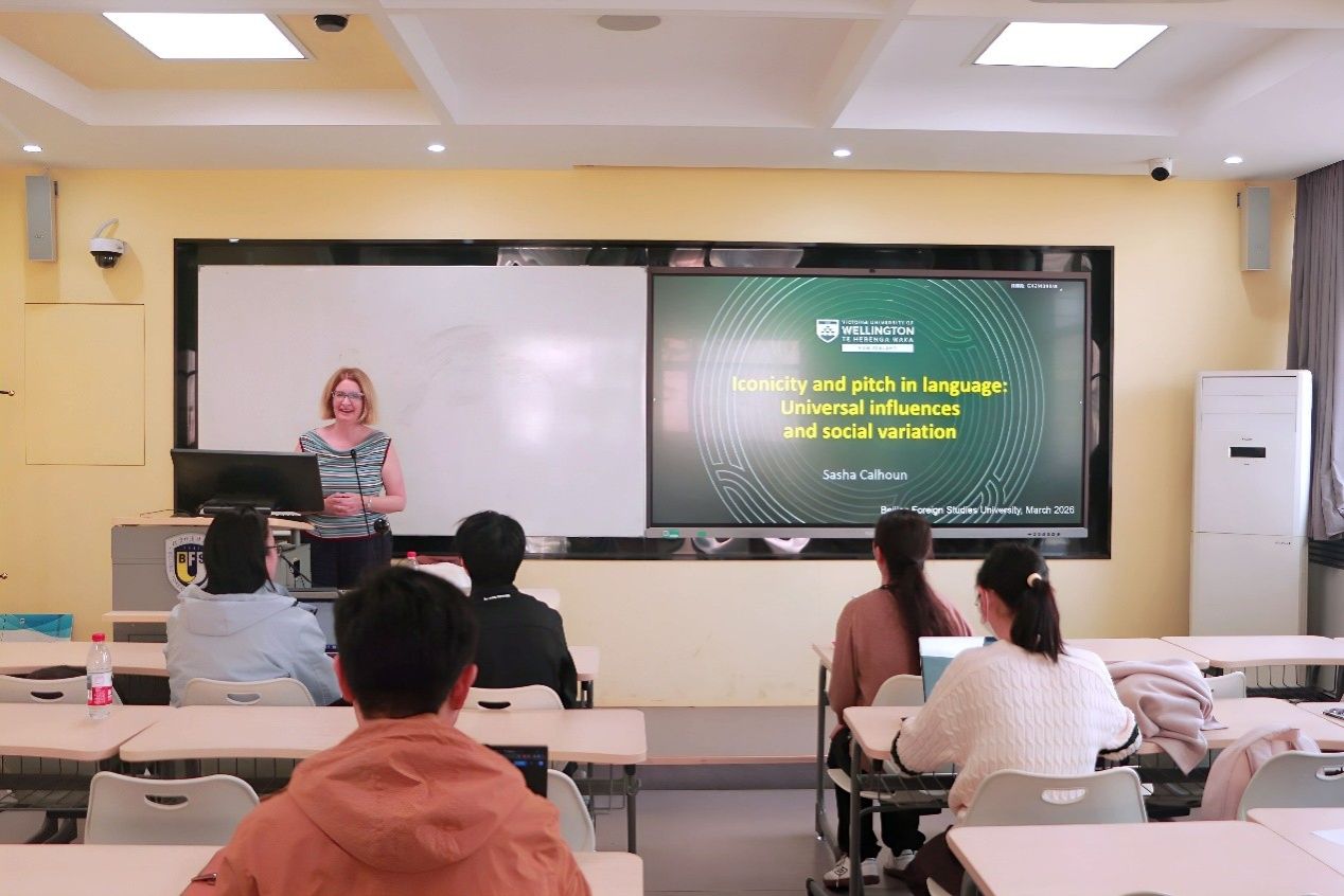 2026年3月26日下午,应北京外国语大学英语学院邀请,新西兰惠灵顿维多利亚大学语言学与应用语言研究学院院长、知名语音学专家Sasha Calhoun教授,在英语学院417大教室为我校师生带来了题为“Sound Symbolic Associations of Pitch: Social Variations and Their Implications”的精彩学术讲座。本次讲座由语言学中心邹婷老师主持,吸引了众多语言学、应用语言学方向的师生到场交流。