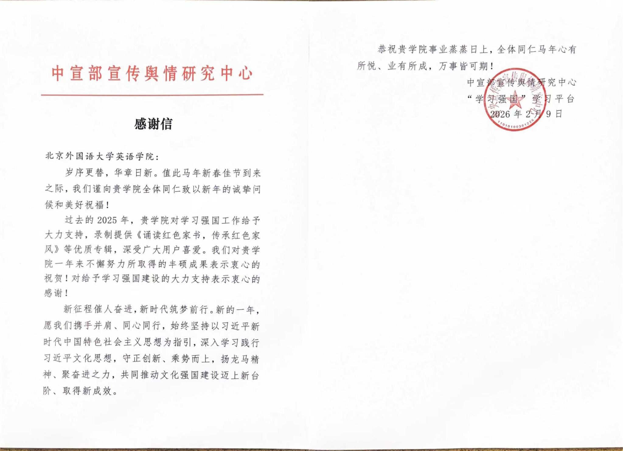 岁序更替,华章日新。近日,北京外国语大学英语学院收到来自“学习强国”学习平台的新春贺信。信中高度肯定了英语学院过去一年在服务国家教育战略、推动文化强国建设中作出的突出贡献,并对英语学院一年来取得的丰硕成果表示衷心的祝贺。