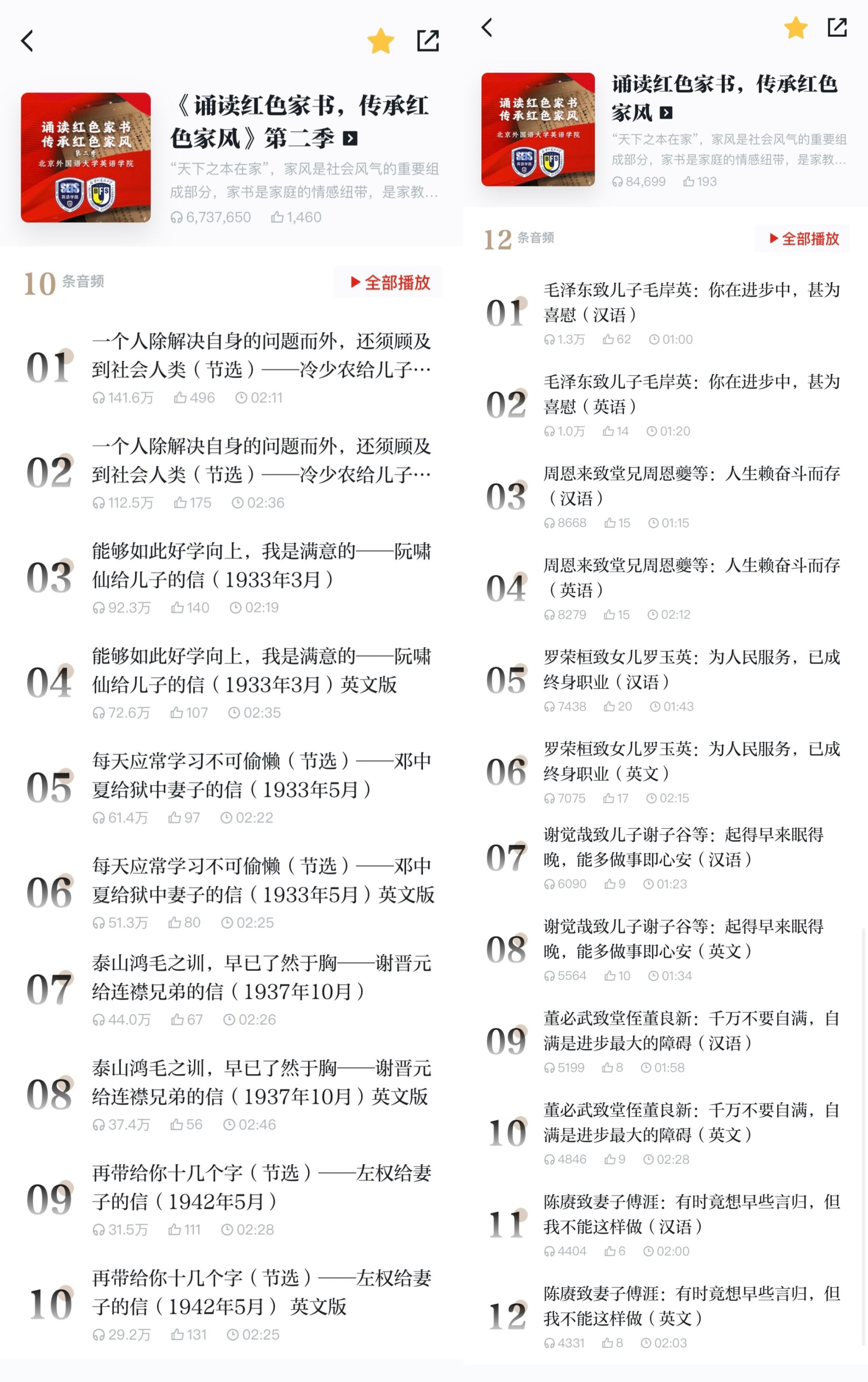 2025年,为深入学习贯彻习近平新时代中国特色社会主义思想,践行习近平文化思想,在英语学院党总支的统筹安排下,广泛调动师生发挥外语学科优势和人文底蕴,参与中英文双语文本的翻译和诵读工作,为“学习强国”平台精心录制提供《诵读红色家书,传承红色家风》等优质音频专辑,将老一辈革命家与革命先烈家书中蕴含的革命精神、家国情怀和亲情力量生动传递给听众,实现跨越时空的情感共鸣与精神传承。该系列两季共22条音频在“电台-强国之声-大学生朗读”频道上线后,累计收获680余万次播放量和千余条点赞,成为平台红色文化传播与思政教育的亮点内容,深受广大用户喜爱。