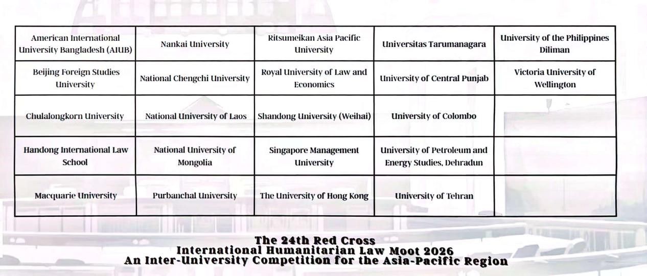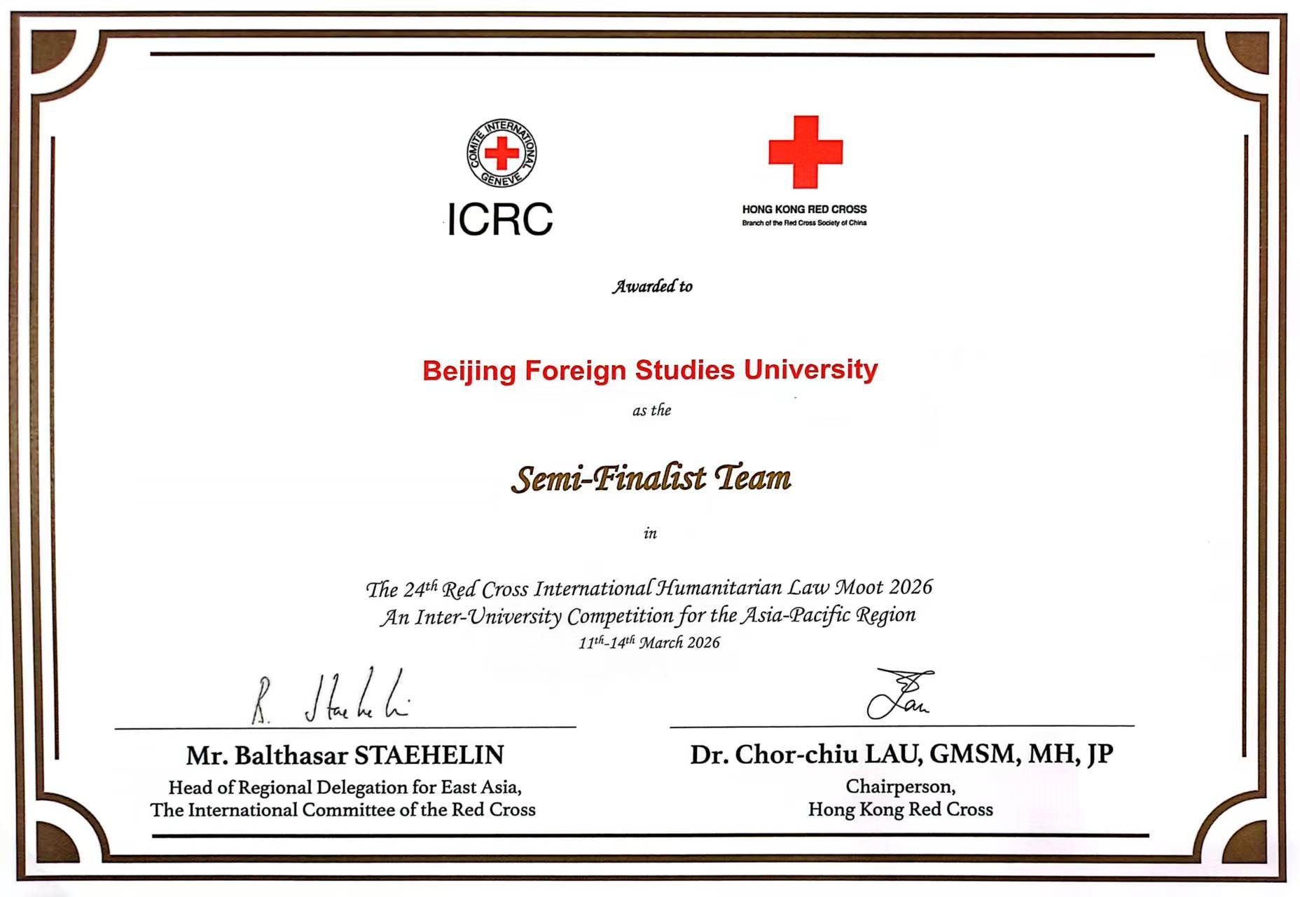 2026年3月11日至14日,第二十四届亚太地区红十字国际人道法模拟法庭竞赛在中华人民共和国香港特别行政区举办。由北京外国语大学英语学院英语(中国政法大学联合培养涉外法治人才)专业2023级本科生邹一鸣与法学院4名同学组成的代表队,在法学院付姝菊老师、法学院2022级本科生邱嘉欣的指导下荣获亚太地区四强,创造了我校代表队参与红十字国际人道法模拟法庭竞赛的最好成绩。