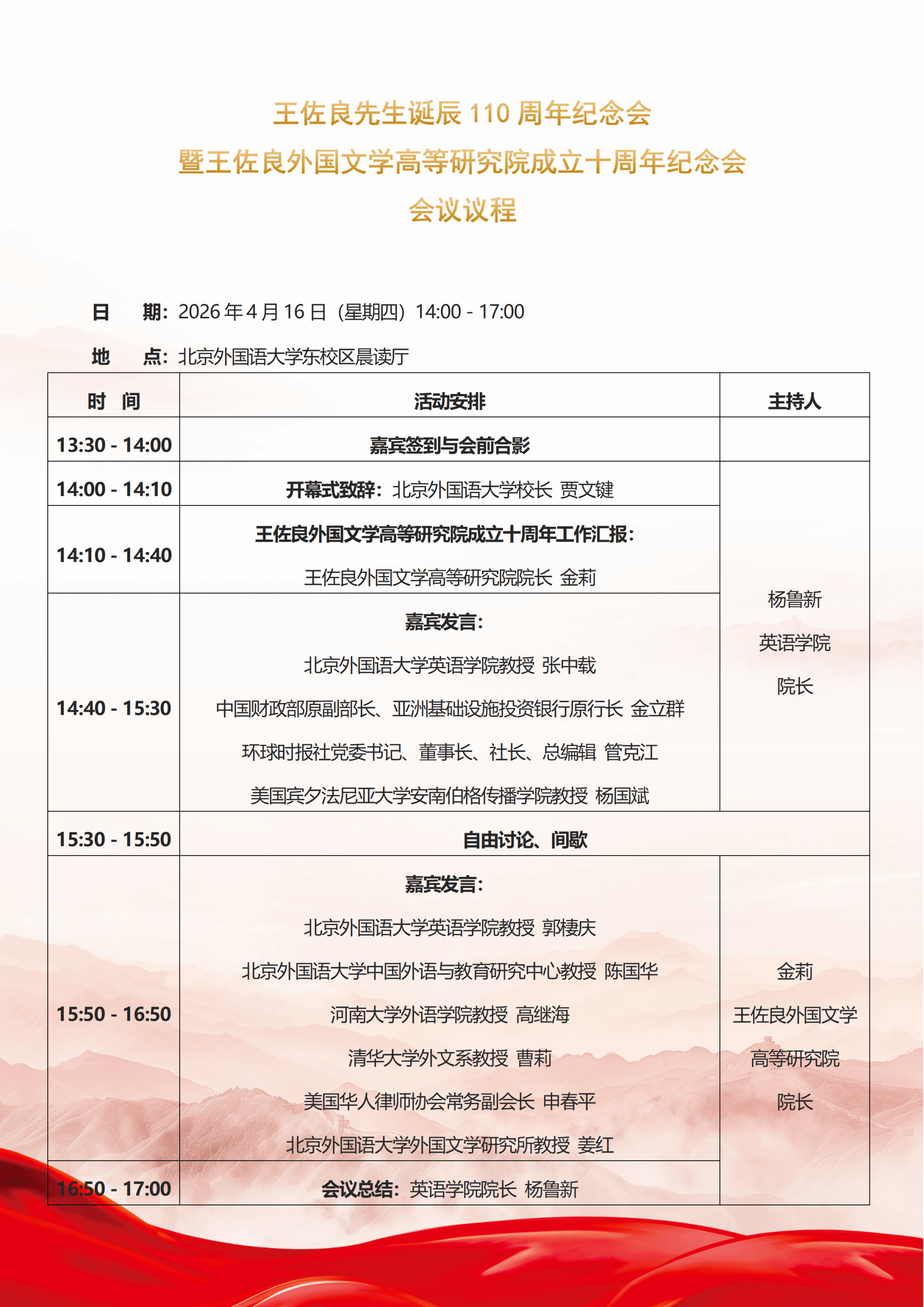 值此王佐良先生诞辰110周年之际,恰逢王佐良外国文学高等研究院成立十周年,特举办本次纪念会,以缅怀先生的学术风范,传承其治学精神,推动我国外国文学研究与外语教育事业的持续发展。